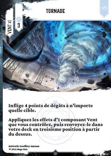 Inflige 4 points de dégâts à n’importe quelle cible.Appliquez les effets d’1 composant Vent que vous contrôlez, puis renvoyez-le dans votre deck en troisième position à partir du dessus.