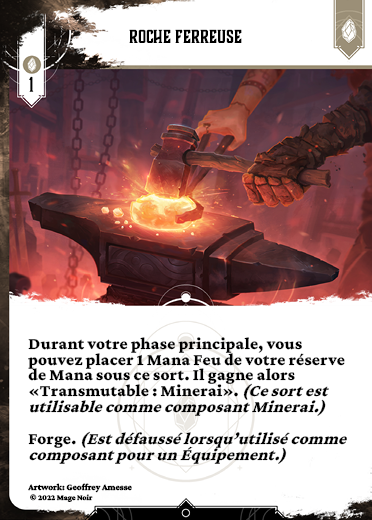 Durant votre phase principale, vous pouvez placer 1 Mana Feu de votre réserve de Mana sous ce sort. Il gagne alors « Transmutable : Minerai » (Ce sort est utilisable comme composant Minerai.)