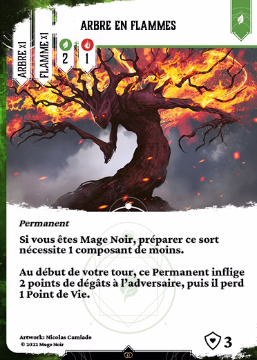 Si vous êtes Mage Noir, "Roi des arbres" va faire que "Arbre en flamme" ne nécessite aucun composant. De plus, celui ça va infliger 2 fois des dégâts à l'adversaire, mais aussi perdre 2 PV.