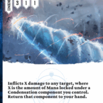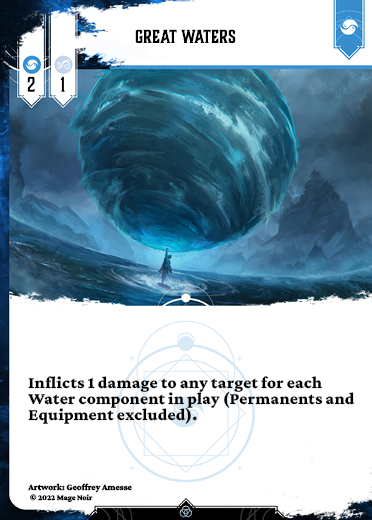 Inflicts 1 damage to any target for each Water component in play (Permanents and Equipment excluded).