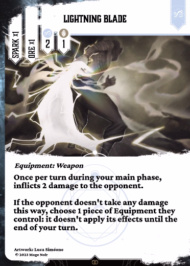 Once per turn during your main phase, inflicts 2 damage to the opponent.If the opponent doesn’t take any damage this way, choose 1 piece of Equipment they control: it doesn’t apply its effects until the end of your turn.