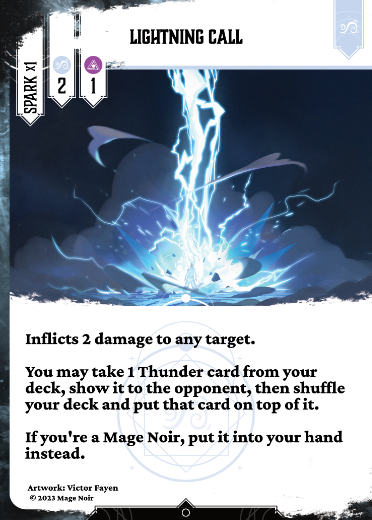 Inflicts 2 damage to any target.You may take 1 Thunder card from your deck, show it to the opponent, then shuffle your deck and put that card on top of it.If you’re a Mage Noir, put it into your hand instead.