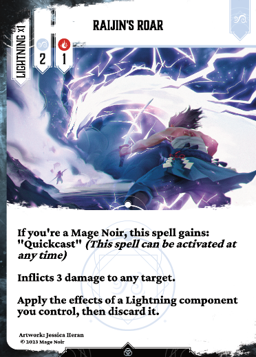 If you’re a Mage Noir, this spell gains: « Quickcast » (This spell can be activated at any time)Inflicts 3 damage to any target.Apply the effects of a Lightning component you control, then discard it.