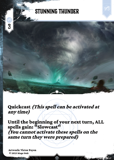 Quickcast (This spell can be activated at any time)Until the beginning of your next turn, ALL spells gain: « Slowcast ». (This spell can’t be activated on the turn it was prepared)