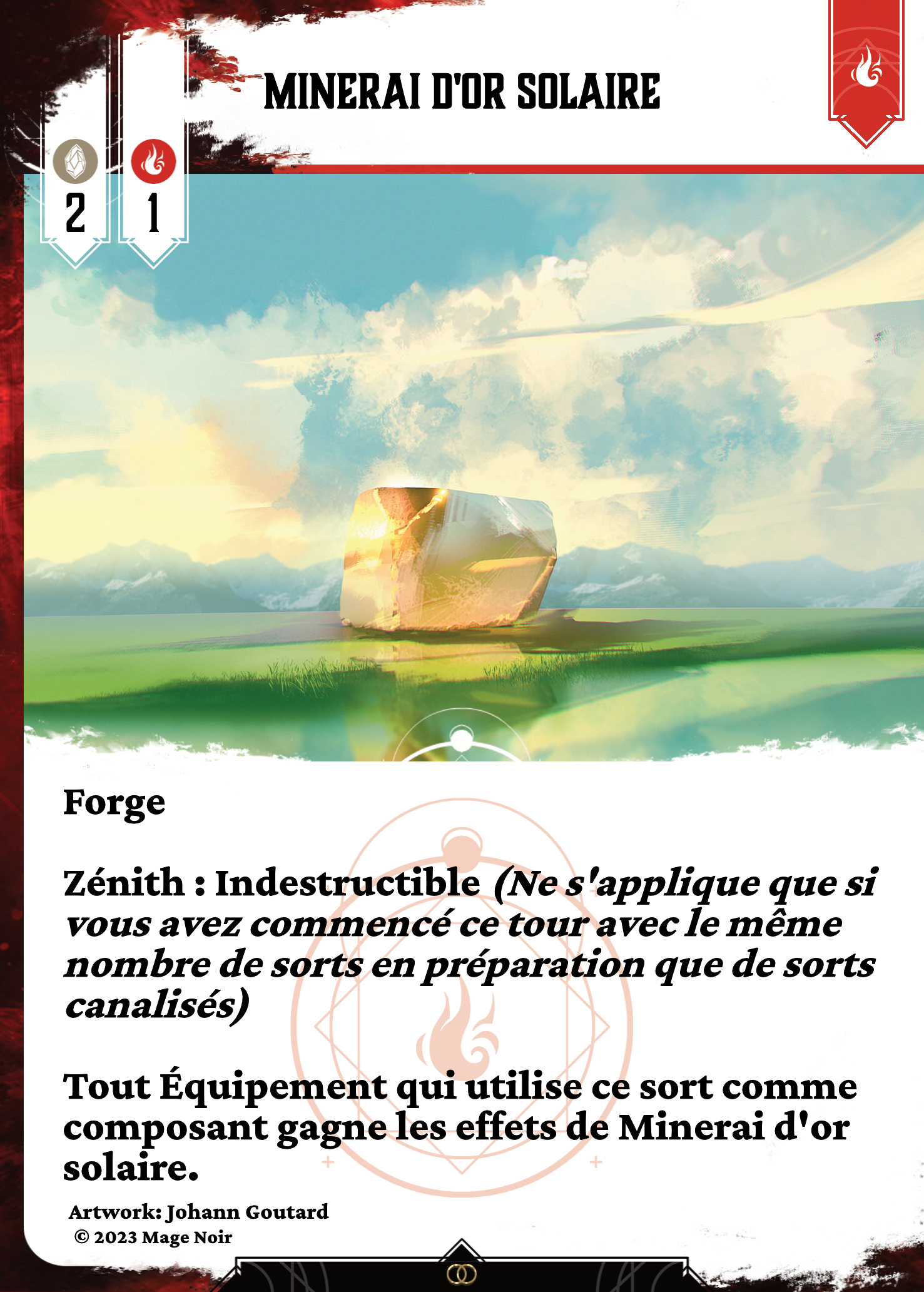 ForgeZénith : Indestructible (Ne s’applique que si vous avez commencé ce tour avec le même nombre de sorts en préparation que de sorts canalisés )Tout Équipement qui utilise ce sort comme composant gagne les effets de Minerai d’or solaire.