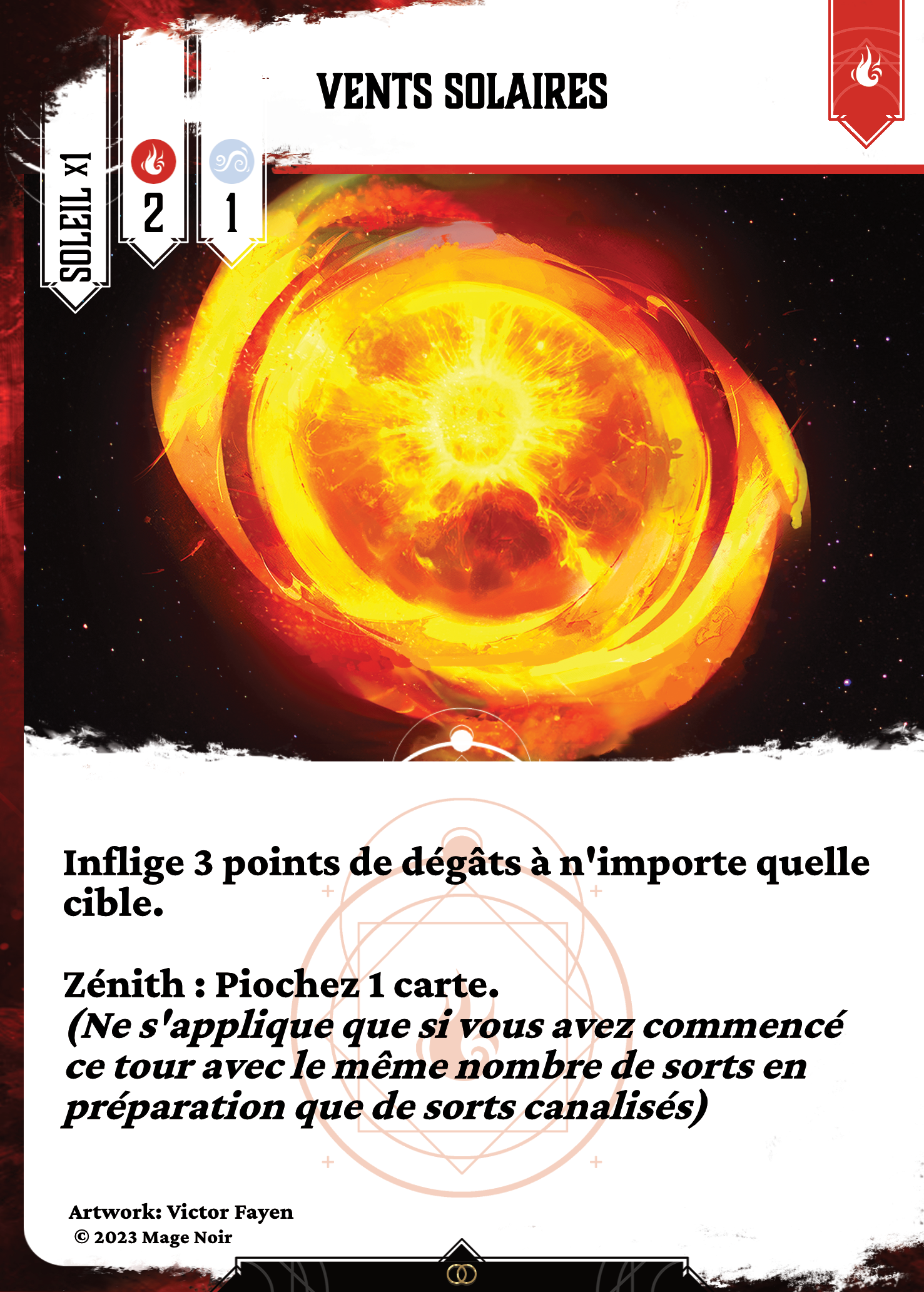 Inflige 3 points de dégâts à n’importe quelle cible.Zénith : Piochez 1 carte.(Ne s’applique que si vous avez commencé ce tour avec le même nombre de sorts en préparation que de sorts canalisés )