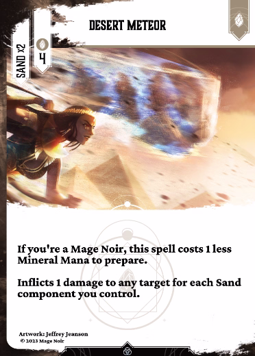 If you’re a Mage Noir, this spell costs 1 less Mineral Mana to prepare.Inflicts 1 damage to any target for each Sand component you control.