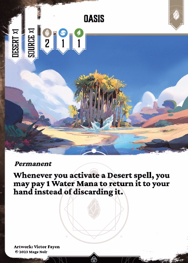 Whenever you activate a Desert spell, you may pay 1 Water Mana to return it to your hand instead of discarding it.