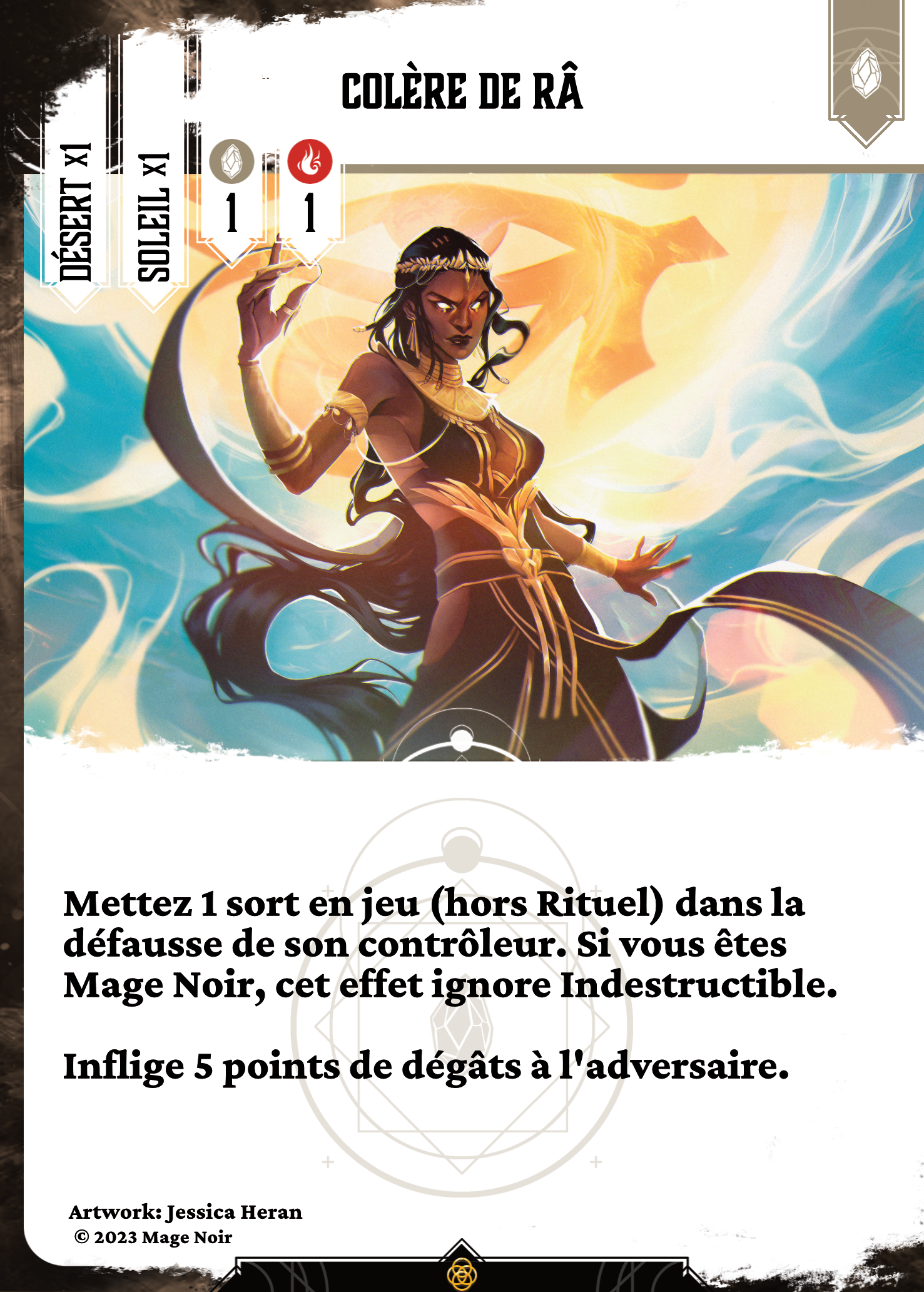 Mettez 1 sort en jeu (hors Rituel) dans la défausse de son contrôleur. Si vous êtes Mage Noir, cet effet ignore Indestructible.Inflige 5 points de dégâts à l’adversaire.