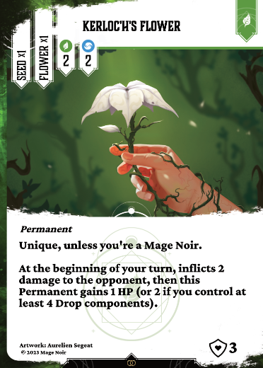 Unique, unless you’re a Mage Noir.At the beginning of your turn, inflicts 2 damage to the opponent, then this Permanent gains 1 HP (or 2 if you control at least 4 Drop components).
