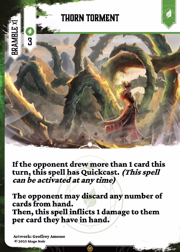 If the opponent drew more than 1 card this turn, this spell has Quickcast. (This spell can be activated at any time) The opponent may discard any number of cards from hand.Then, this spell inflicts 1 damage to them per card they have in hand.