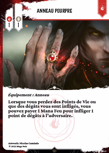 Lorsque vous perdez des Points de Vie ou que des dégâts vous sont infligés, vous pouvez payer 1 Mana Feu pour infliger 1 point de dégâts à l’adversaire.