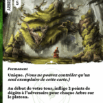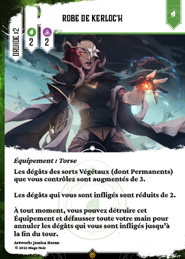 Les dégâts des sorts Végétaux (dont Permanents) que vous contrôlez sont augmentés de 3.Les dégâts qui vous sont infligés sont réduits de 2.A tout moment, vous pouvez détruire cet Équipement et défausser toute votre main pour annuler les dégâts qui vous sont infligés jusqu’à la fin du tour.