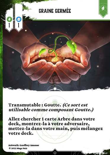 Transmutable : Goutte (Ce sort est utilisable comme composant Goutte.)Allez chercher 1 carte Arbre dans votre deck, montrez-la à votre adversaire, mettez-la dans votre main, puis mélangez votre deck.