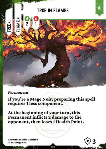 If you're a Mage Noir and also control "King of Trees", preparing "Tree in flames" costs no components. Moreover, it hits twice at the beginning of the turn, but also loses 2 HP.
