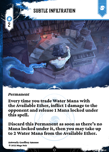 Every time you trade Water Mana with the Available Ether, inflict 1 damage to the opponent and release 1 Mana locked under this spell.