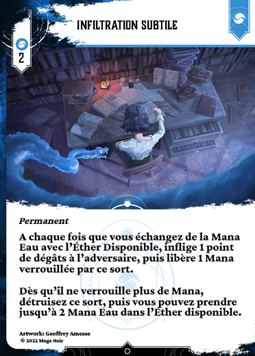 A chaque fois que vous échangez de la Mana Eau avec l’Ether Disponible, inflige 1 point de dégâts à l’adversaire, puis libère 1 Mana verrouillée par ce sort.