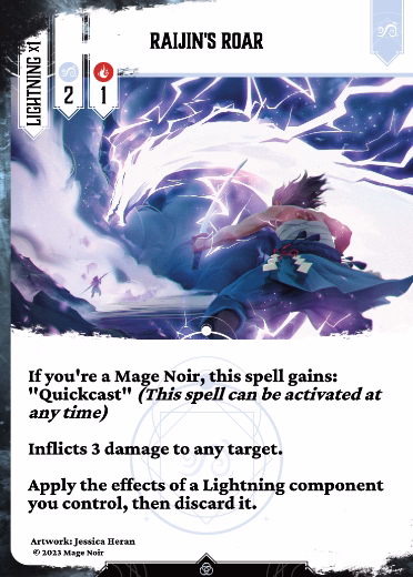 If you’re a Mage Noir, this spell gains: « Quickcast » (This spell can be activated at any time)Inflicts 3 damage to any target.Apply the effects of a Lightning component you control, then discard it.