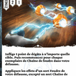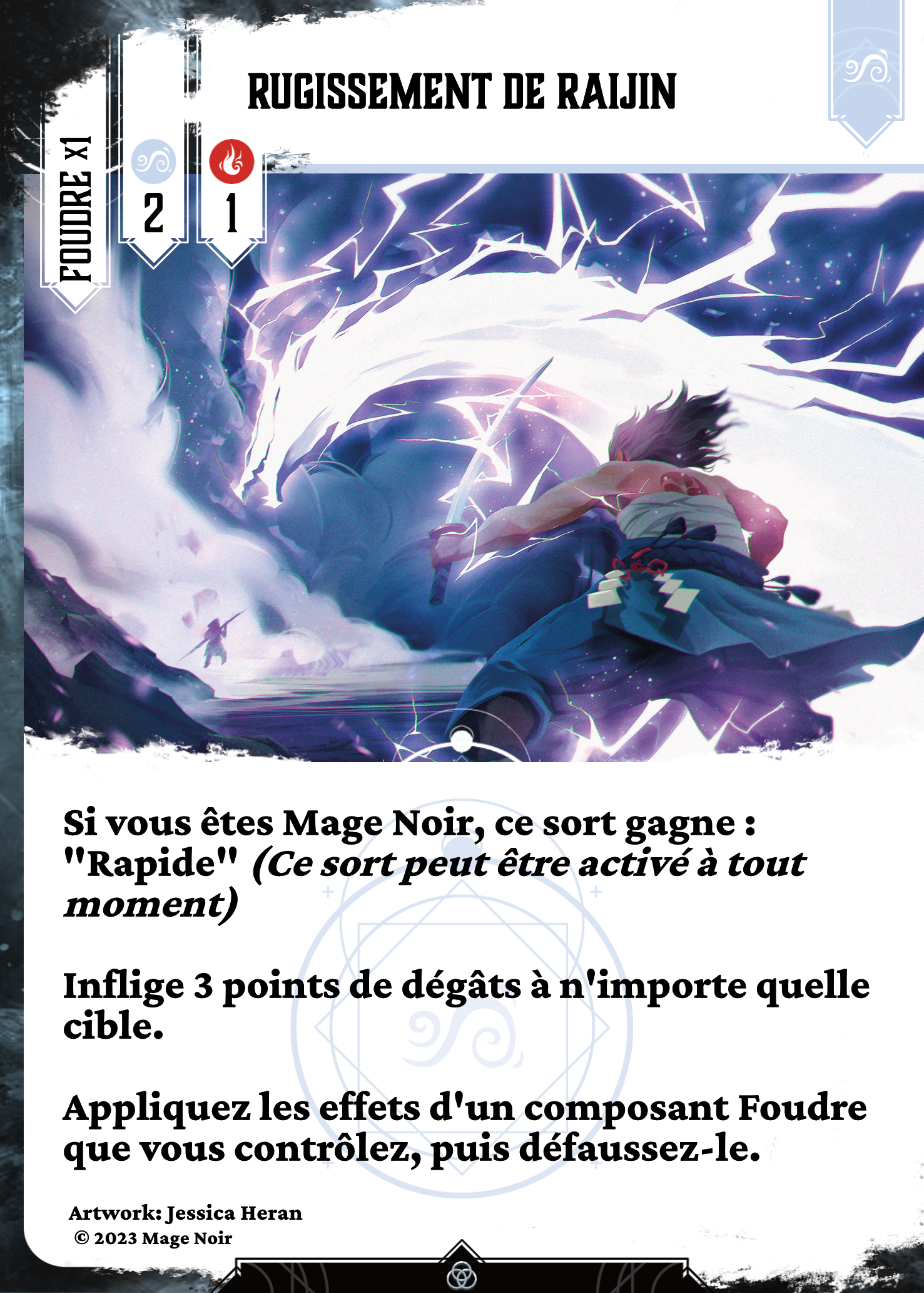 Si vous êtes Mage Noir, ce sort gagne : « Rapide ». (Ce sort peut être activé à tout moment )Inflige 3 points de dégâts à n’importe quelle cible.Appliquez les effets d’un composant Foudre que vous contrôlez, puis défaussez-le.