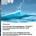 Rapide (Ce sort peut être activé à tout moment )Jusqu’au début de votre prochain tour, TOUS les sorts gagnent : « Lent ». (Ce sort ne peut pas être activé le tour durant lequel il a été préparé )