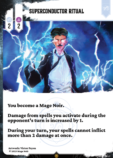 You become a Mage Noir.Damage from spells you activate during the opponent’s turn is increased by 1. During your turn, your spells cannot inflict more than 2 damage at once.