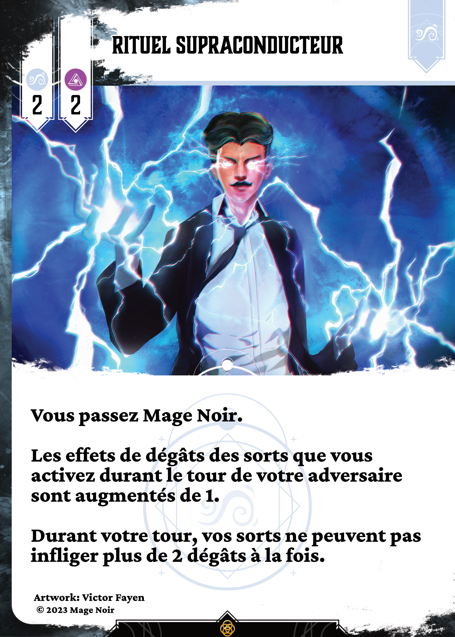Vous passez Mage Noir.Les effets de dégâts des sorts que vous activez durant le tour de votre adversaire sont augmentés de 1.Durant votre tour, vos sorts ne peuvent pas infliger plus de 2 dégâts à la fois.