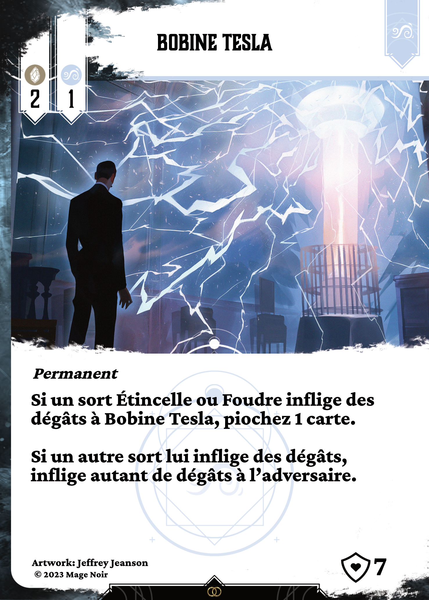 Si un sort Étincelle ou Foudre inflige des dégâts à Bobine Tesla, piochez 1 carte.Si un autre sort lui inflige des dégâts, inflige autant de dégâts à l’adversaire.