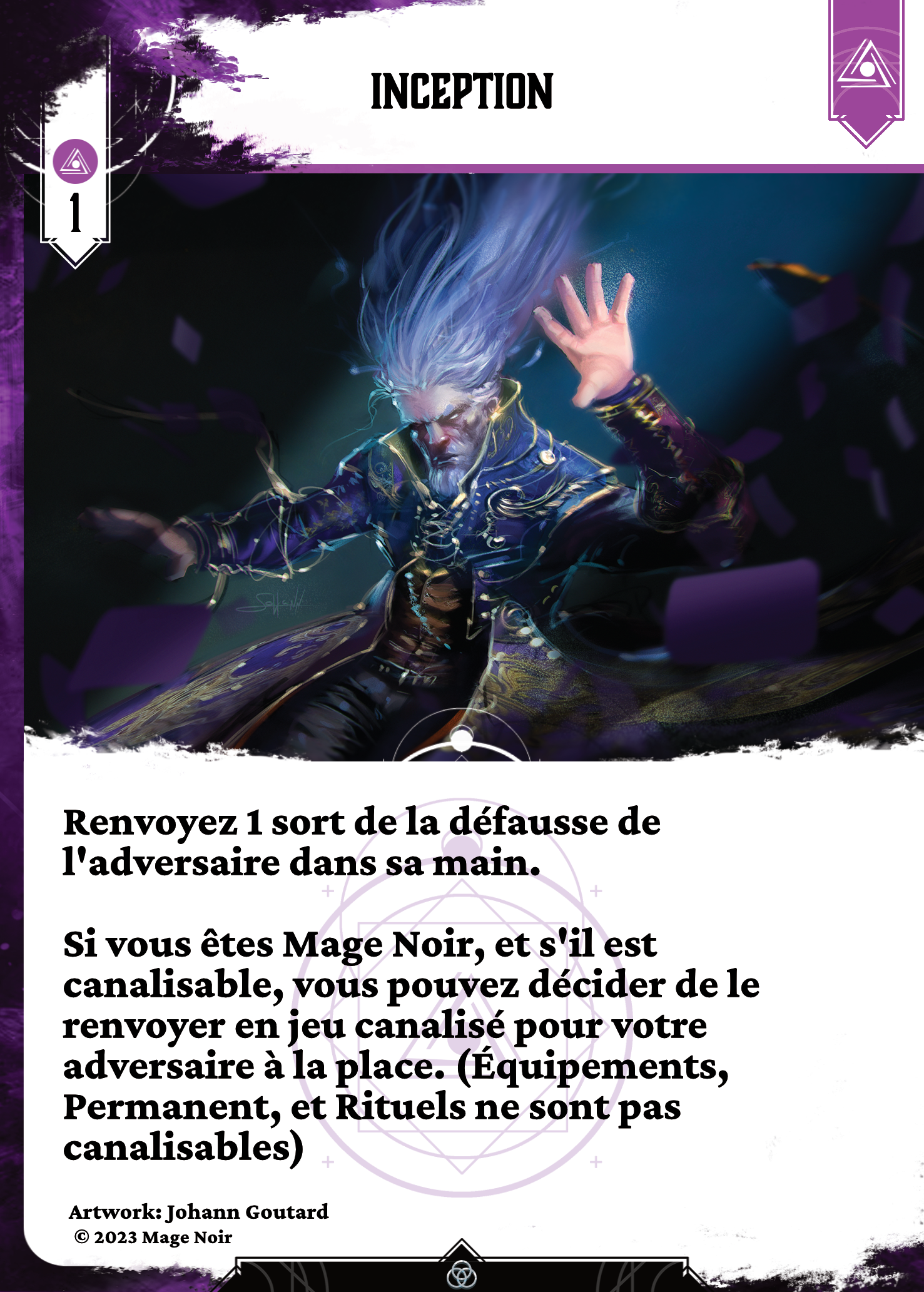 Renvoyez 1 sort de la défausse de l’adversaire dans sa main.Si vous êtes Mage Noir, et s’il est canalisable, vous pouvez décider de le renvoyer en jeu canalisé pour votre adversaire à la place. (Équipements, Permanents, et Rituels ne sont pas canalisables)