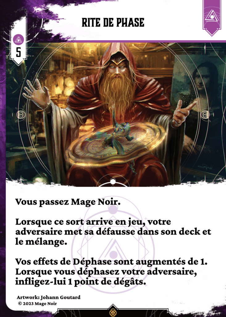 Vous passez Mage Noir.Lorsque ce sort arrive en jeu, votre adversaire met sa défausse dans son deck et le mélange.Vos effets de Déphase sont augmentés de 1.Lorsque vous déphasez votre adversaire, infligez-lui 1 point de dégâts.