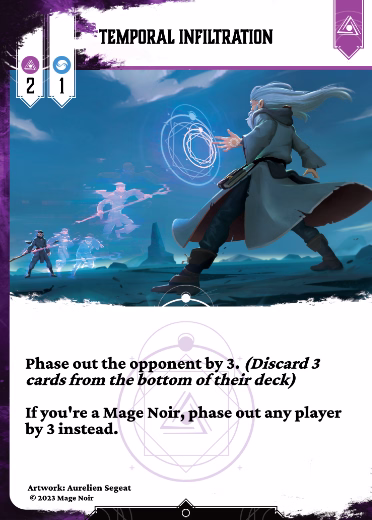 Phase out the opponent by 3. (Discard 3 cards from the bottom of their deck)If you’re a Mage Noir, phase out any player by 3 instead.