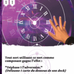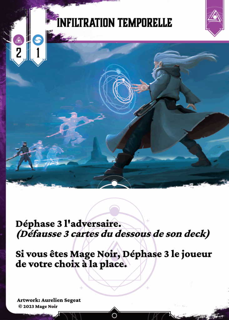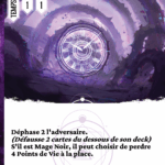 Déphase 3 l’adversaire.(Défausse 3 cartes du dessous de son deck )Si vous êtes Mage Noir, Déphase 3 le joueur de votre choix à la place.