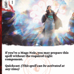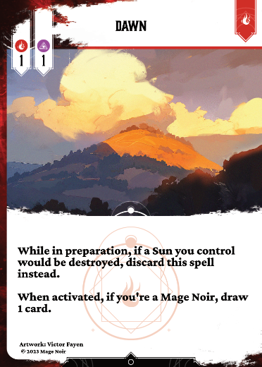 While in preparation, if a Sun you control would be destroyed, discard this spell instead.When activated, if you’re a Mage Noir, draw 1 card.