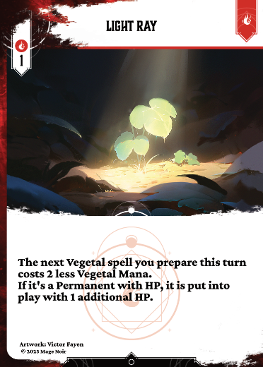 The next Vegetal spell you prepare this turn costs 2 less Vegetal Mana.If it’s a Permanent with HP, it is put into play with 1 additional HP.