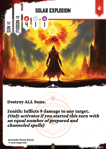 Destroy ALL Suns.Zenith: Inflicts 9 damage to any target.(Only activates if you started this turn with an equal number of prepared and channeled spells)