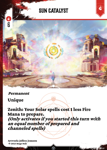 UniqueZenith: Your Solar spells cost 1 less Fire Mana to prepare. (Only activates if you started this turn with an equal number of prepared and channeled spells)