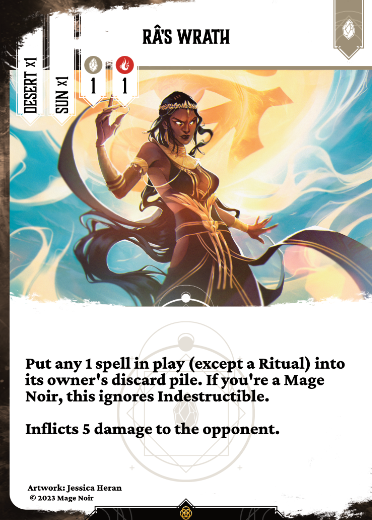 Put any 1 spell in play (except a Ritual) into its owner’s discard pile. If you’re a Mage Noir, this ignores Indestructible.Inflicts 5 damage to the opponent.