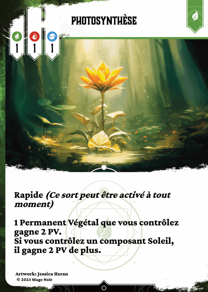 Rapide (Ce sort peut être activé à tout moment )1 Permanent Végétal que vous contrôlez gagne 2 PV.Si vous contrôlez un composant Soleil, il gagne 2 PV de plus.
