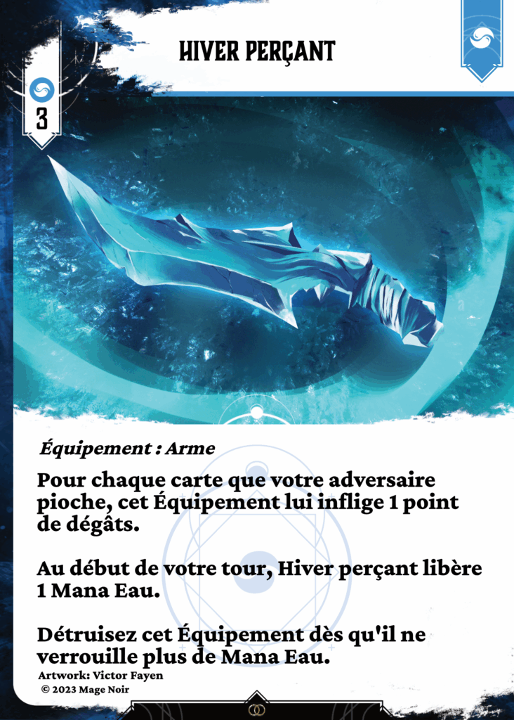 Pour chaque carte que votre adversaire pioche, cet Équipement lui inflige 1 point de dégâts.Au début de votre tour, Hiver perçant libère 1 Mana Eau.Détruisez cet Équipement dès qu’il ne verrouille plus de Mana Eau.
