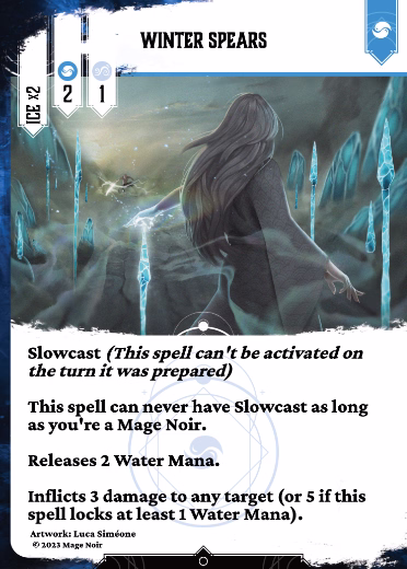 Slowcast (This spell can’t be activated on the turn it was prepared) This spell can never have Slowcast as long as you’re a Mage Noir.Releases 2 Water Mana.Inflicts 3 damage to any target (or 5 if this spell locks at least 1 Water Mana).