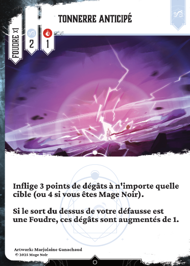 Si le sort du dessus de votre défausse est une Foudre, ces dégâts sont augmentés de 1.