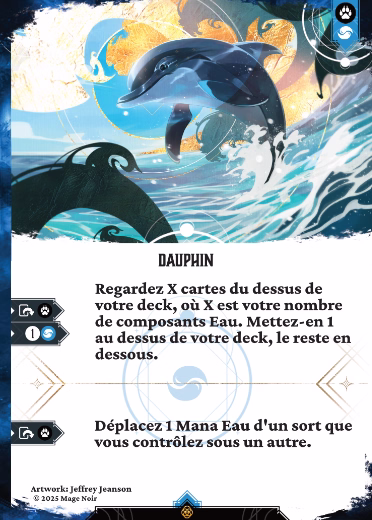 1 seul flocon de neige suffit en composant glace et goutte pour le deck : on n’a pas besoin de plus ! On pose ses vagues sans les déplacer en composants tant qu’on n’a pas d’Océan (idéalement avec une protection) à poser. Une fois l’Océan en place, le dauphin et un flocon de neige peuvent le maintenir en vie un tour supplémentaire à 2 vagues. Idéalement une des deux vagues est une vague mordante, auquel cas le dauphin et la vague pourront le maintenir en vie 2 tours à eux seuls. Feed ses océans de mana avec le dauphin est dans tous les cas une bonne chose car cela permet de remettre plus de mana eau dans le pool disponible pour son prochain tour. Enfin le mur de glace est une bonne défense peu chère car son mana eau retourne en mana disponible. Il peut devenir un distributeur à mana avec la compétence du dauphin si celle-ci ne sert pas à alimenter un océan et si non détruit sa réactivation sur un tour clé grâce à la compétence du dauphin est tout à fait possible.